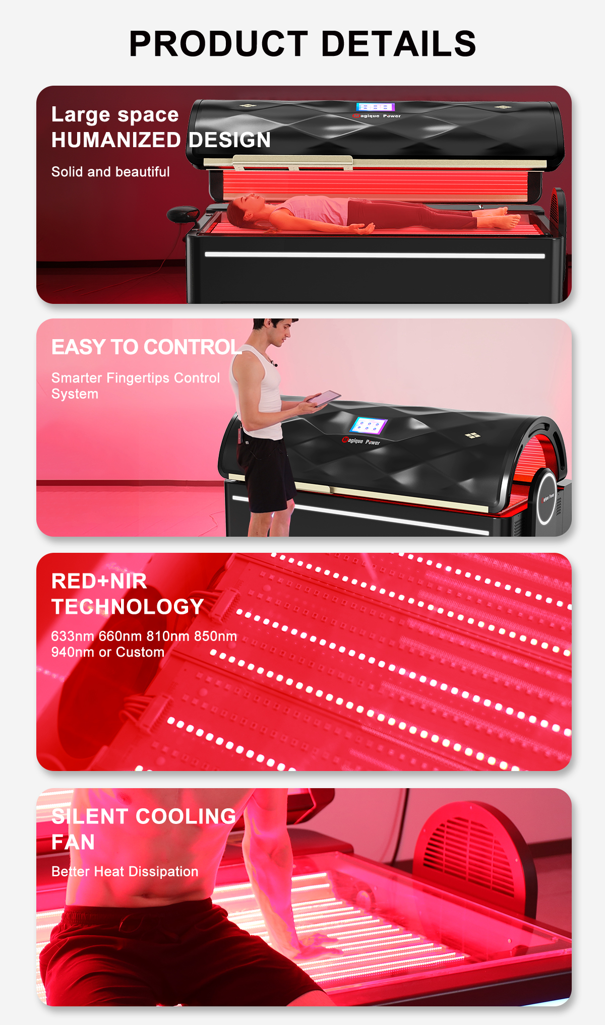 Light Source: Taiwan Epistar Irradiance: 129 mW/cm² Wavelengths: 633nm, 660nm, 810nm, 850nm, 940nm (customizable),support skin rejuvenation, muscle recovery, inflammation reduction, fat loss, and wound healing 360° Full-Body Coverage: Delivers consistent and deep-penetrating light across the entire body to maximize therapeutic outcomes in every session Supports full brand customization to strengthen your professional identity and increase your competitive edge and profitability